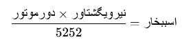 در این فرمول، نیروی گشتاور به پوند فوت و دور موتور به دور در دقیقه (RPM) اندازه‌گیری می‌شود. این فرمول نشان می‌دهد که اسب بخار وابسته به دو عامل گشتاور و دور موتور است. هرچه نیروی گشتاور و دور موتور بیشتر باشند، توان خروجی موتور به‌صورت خطی افزایش می‌یابد.